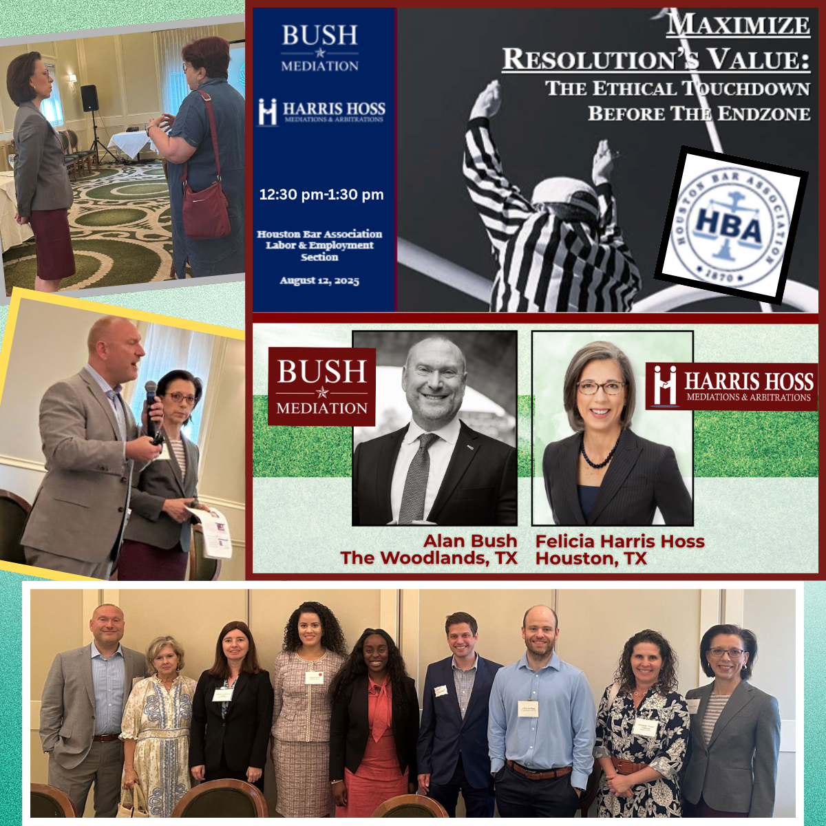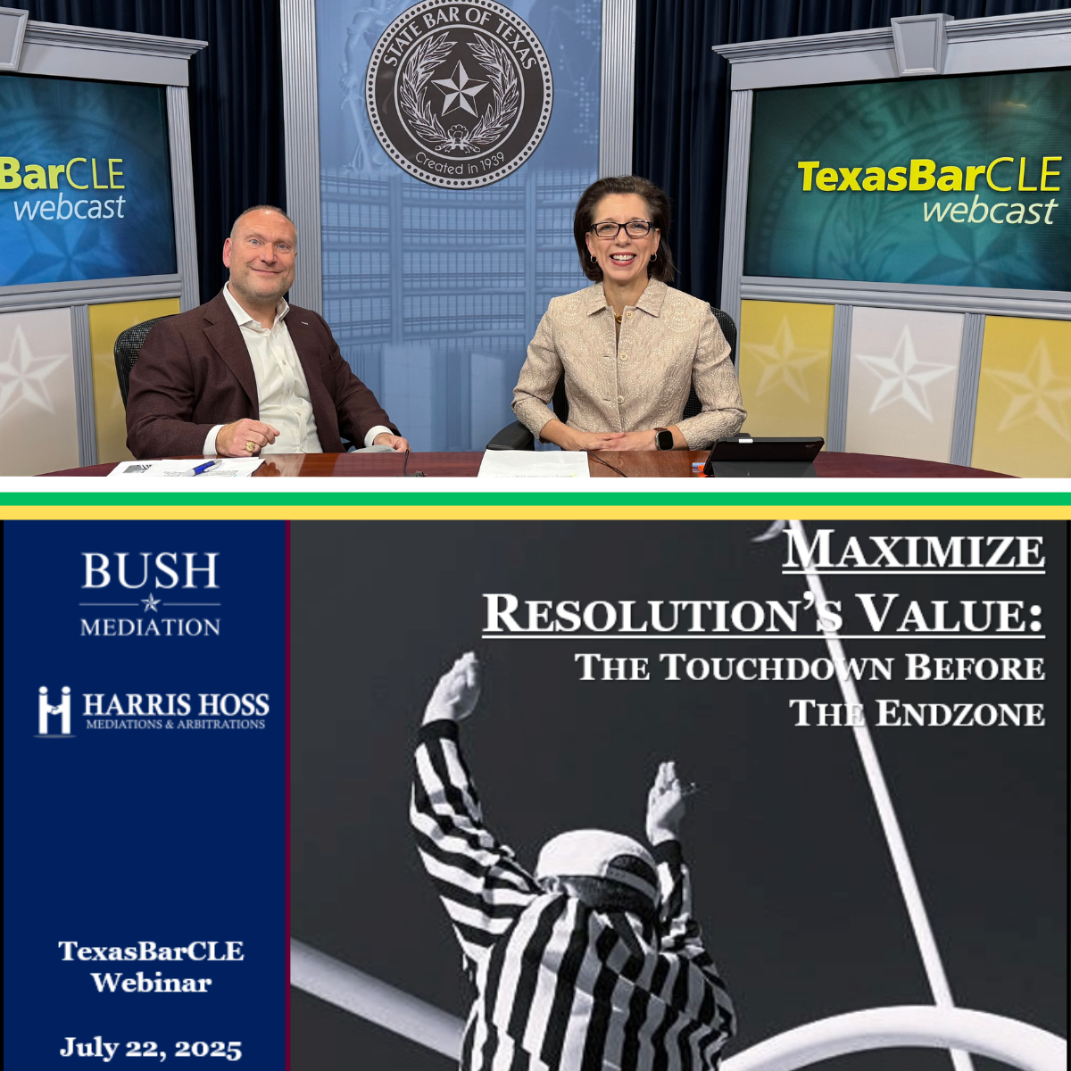 Harris Hoss was thrilled to team up with Alan Bush (Bush Mediation) in Austin, Texas for a live TexasBarCLE Webinar on a topic near and dear to her heart -- mediation timing. Both Texas A&M Aggies, Bush and Harris Hoss titled their presentation Maximize Resolution's Value: The Touchdown Before the Endzone and incorporated classic scenes from football-centric movies to liven up the crowd. Many thanks to the entire TexasBarCLE team for their hospitality and, especially, to Alan Bush for his teamwork!