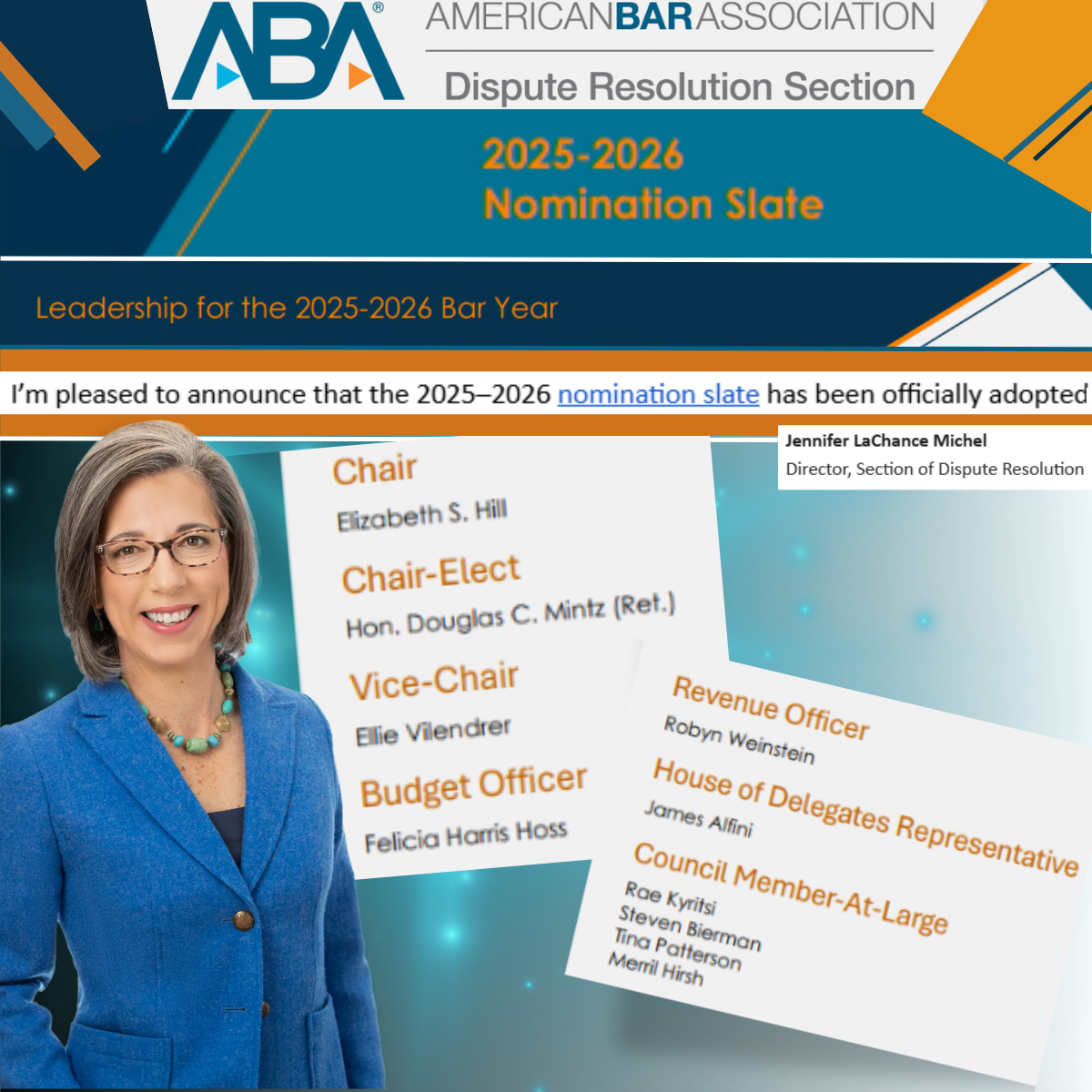 The Resolution was submitted by the ABA Section of Dispute Resolution, along with co-sponsorships from the ABA Section of State and Local Government and the ABA Senior Lawyers Division. Prior to its submission, the Resolution also received the support of the ABA Business Law Section, ABA Section of Labor and Employment, ABA Young Lawyers Division, and ABA Section of Government and Public Sector Lawyers. To access a copy of the Resolution, Report, and link to watch the presentations made to the House of Delegates in support of Resolution 500, click the image.