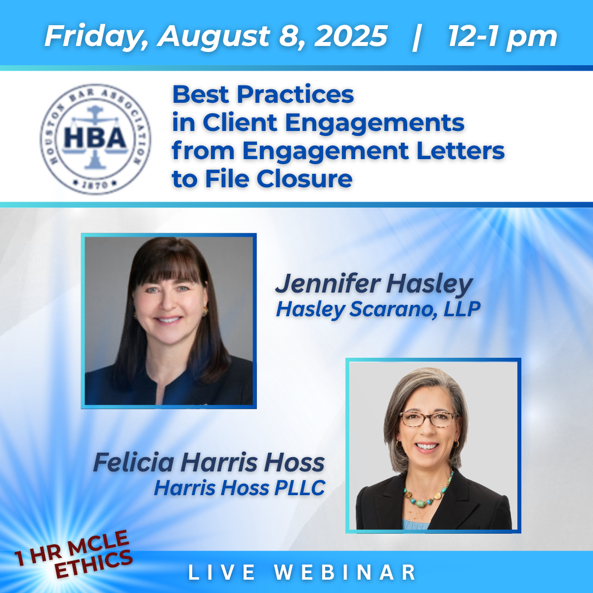 As part of the Houston Bar Association (HBA) ongoing CLE webinar series, Harris Hoss joined Jennifer Hasley on August 8th for a live, lunch-hour webinar to talk about best practices in client engagement from initial contact through closure and file management to avert and resolve disputes and satisfy the latest Texas ethics rules. As an arbitrator and former co-chair of the HBA Fee Dispute Committee, Harris Hoss presented best practice and ethical guidelines for resolution of lawyer/client and lawyer/lawyer fee disputes and spotlighted the HBA Fee Dispute Committee's work in arbitrating those disputes at no cost to any party.