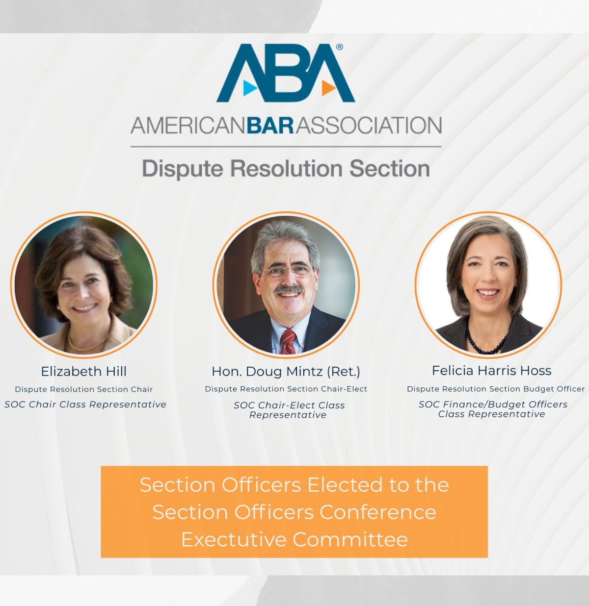 The ABA Section Officers Conference (SOC) is a leadership hub within the ABA that brings together the volunteer leaders (i.e., Chairs, Chairs-Elect, Vice Chairs, and Finance Officers) of the ABA's many practice-area sections and professional groups. As Budget Officer for the ABA Section of Dispute Resolution, Harris Hoss was elected to a one-year term to serve Class Representative for Finance Officers on the SOC Executive Committee.