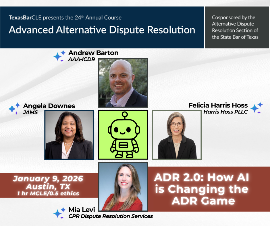 On January 9, 2026, Harris Hoss has the honor of moderating a panel of distinguished ADR Provider leaders -- Andrew Barton (AAA-ICDR), Angela Downes (JAMS), and Mia Lei (CPR Dispute Resolution Services) on the topic of "ADR 2.0: How AI is Changing the ADR Game". The presentation is part of the State Bar of Texas ADR Section's Annual CLE which is held live in Austin, Texas and simulcast online for remote participation. Registration is open, click on the image to access registration information.