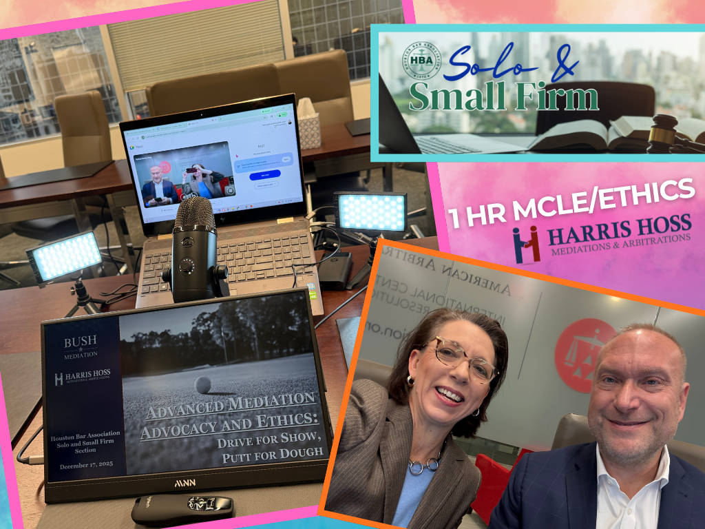 On December 17, 2025, Harris Hoss and Alan Bush had the pleasure of broadcasting live from the AAA-ICDR Houston offices their presentation entitled "Advanced Mediation Advocacy and Ethics: Drive for Show, Putt for Dough" for the HBA Solo & Small Firm Section and 1 hour CLE/Ethics credit.