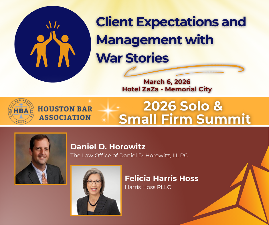 The Houston Bar Association's (HBA) Solo & Small Firm Section supports the unique needs of solo practitioners, small law firms, and niche legal areas. Harris Hoss is thrilled to be a part of the Section's inaugural CLE event at Hotel ZaZa-Memorial City on March 6th along with Daniel Horowitz talking about Client Expectations and Management with War Stories. Click the image to register now for 6 hours of MCLE/1.5 hours ethics!