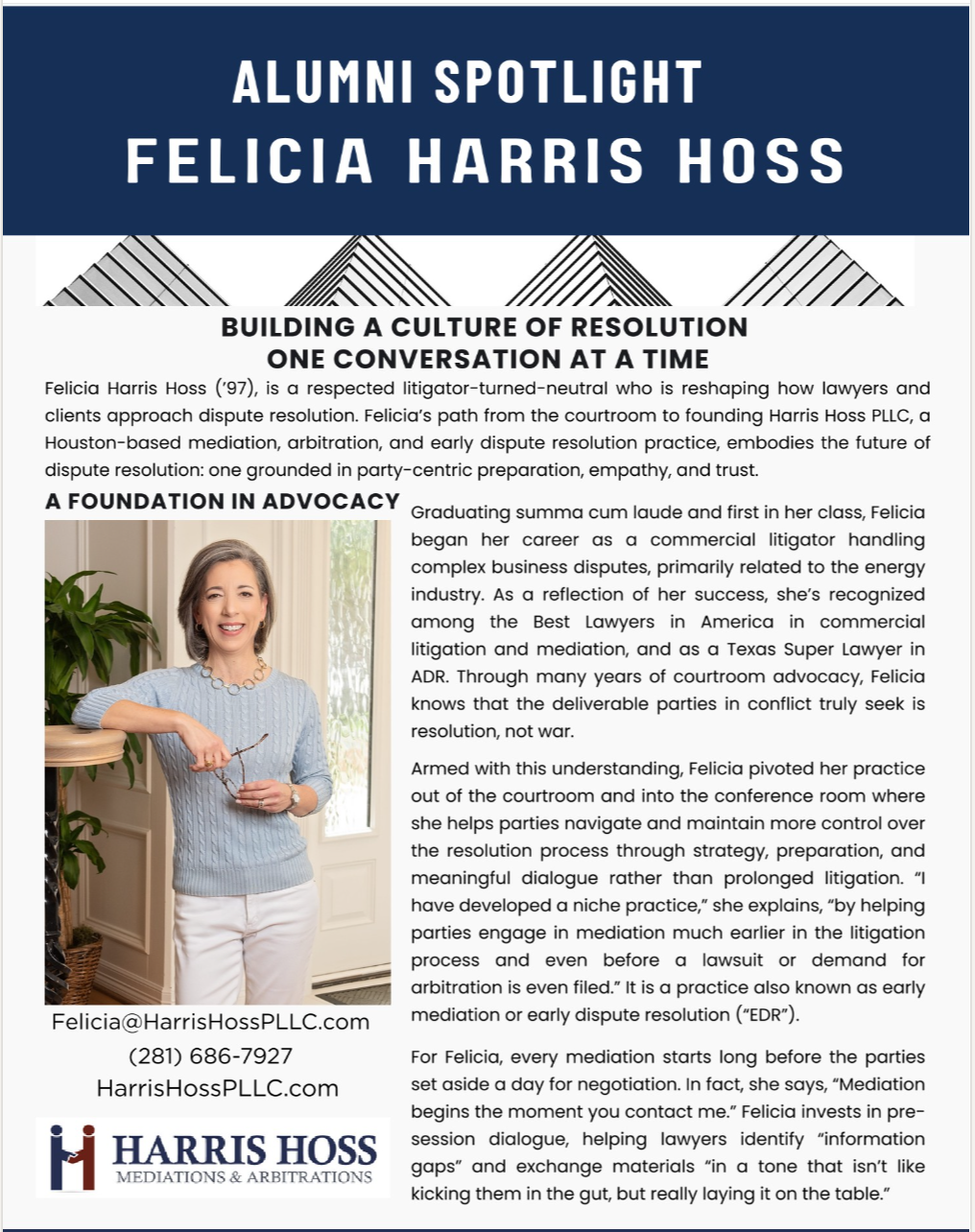 The Dispute Resolution Board - The Frank Evans Center for Dispute Resolution South Texas College of Law Houston recognized Harris Hoss in its Alumni Spotlight for her approach to early dispute resolution and efforts to reshape how lawyers and clients think and resolve conflict. Click the image to the left to view The Dispute Resolution Board Newsletter.